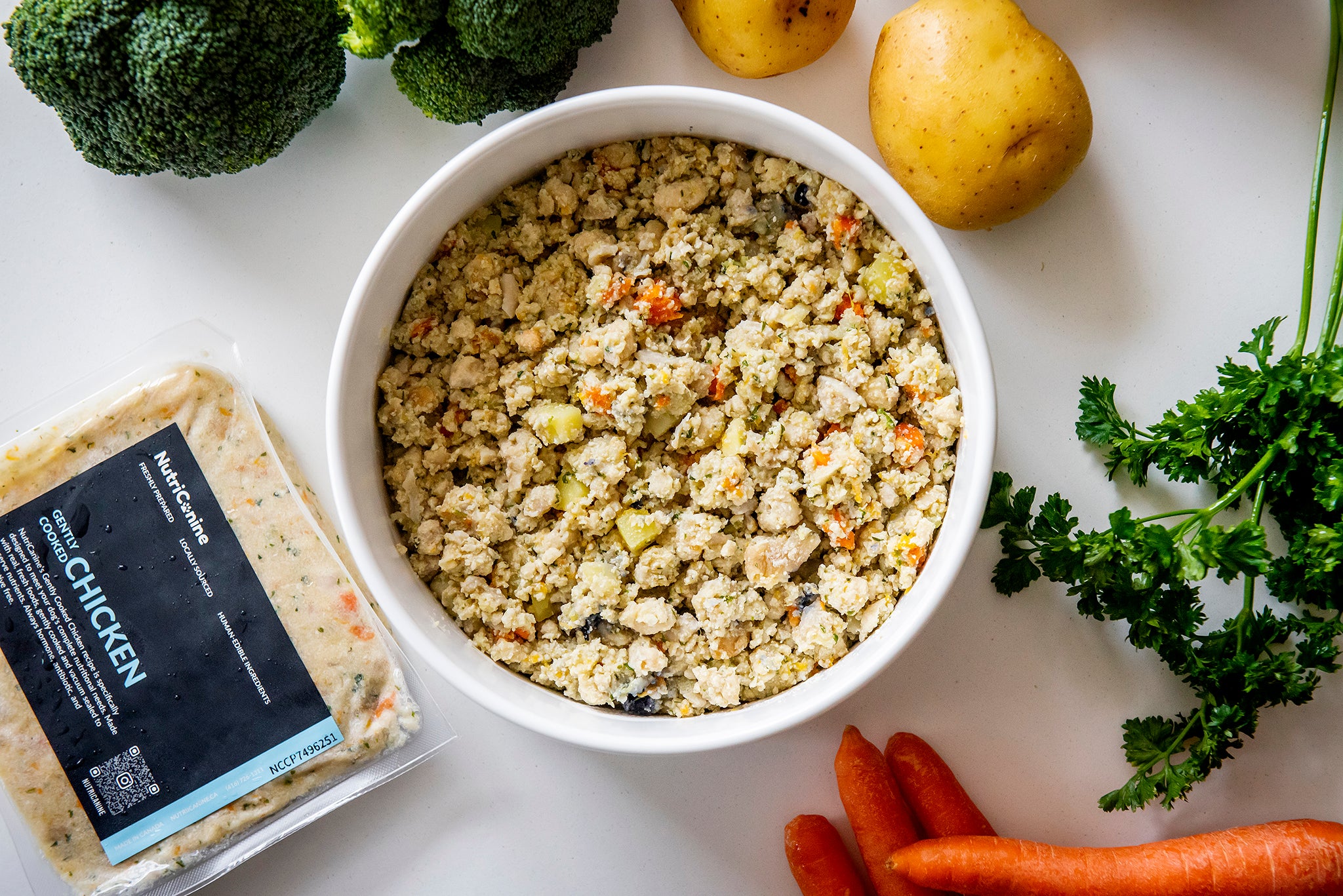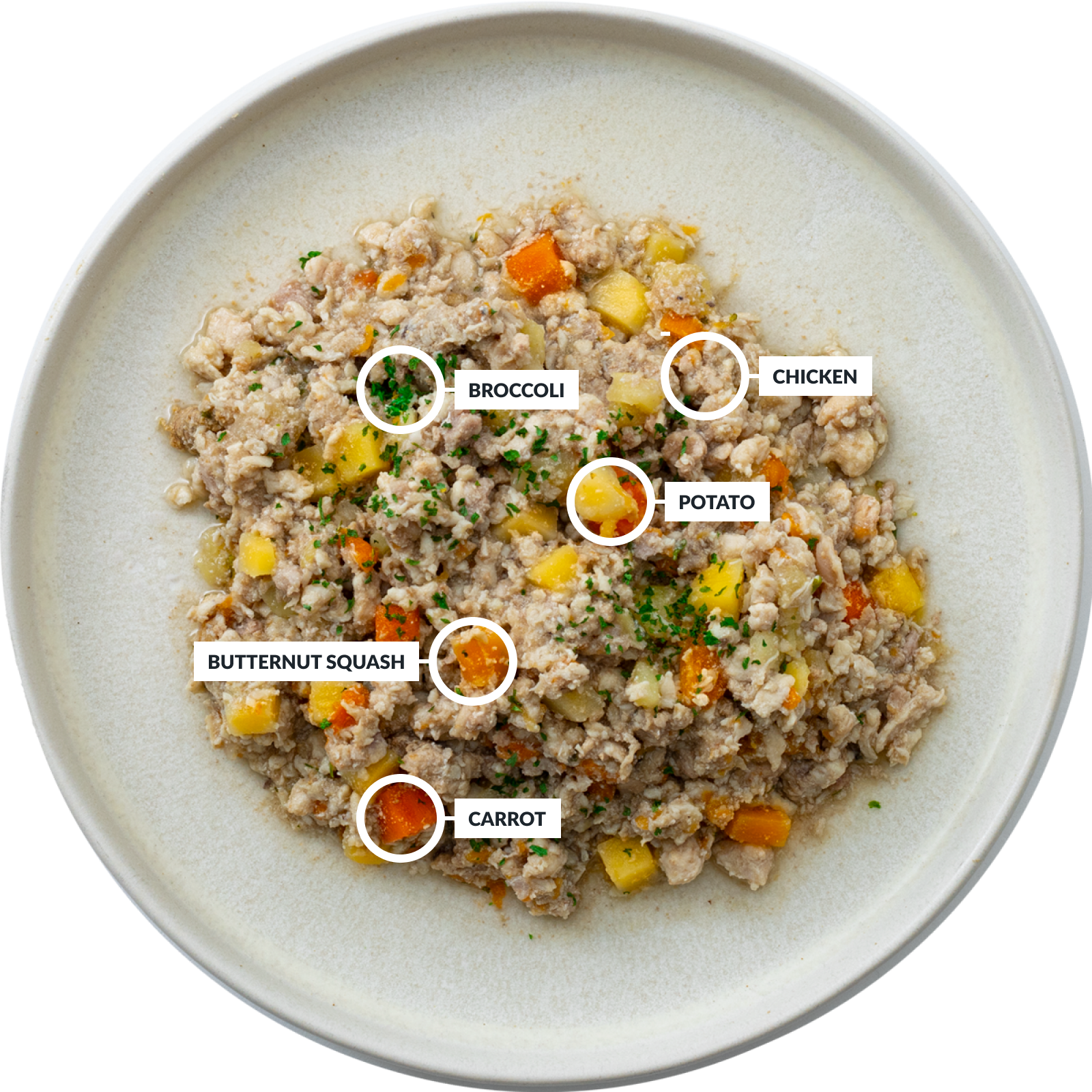 Chicken (ground), potato, butternut squash, chicken liver, carrots, broccoli, mixed berries, NutriCanine Vitamin & Mineral Mix, sunflower oil, fish oil, parsley.
