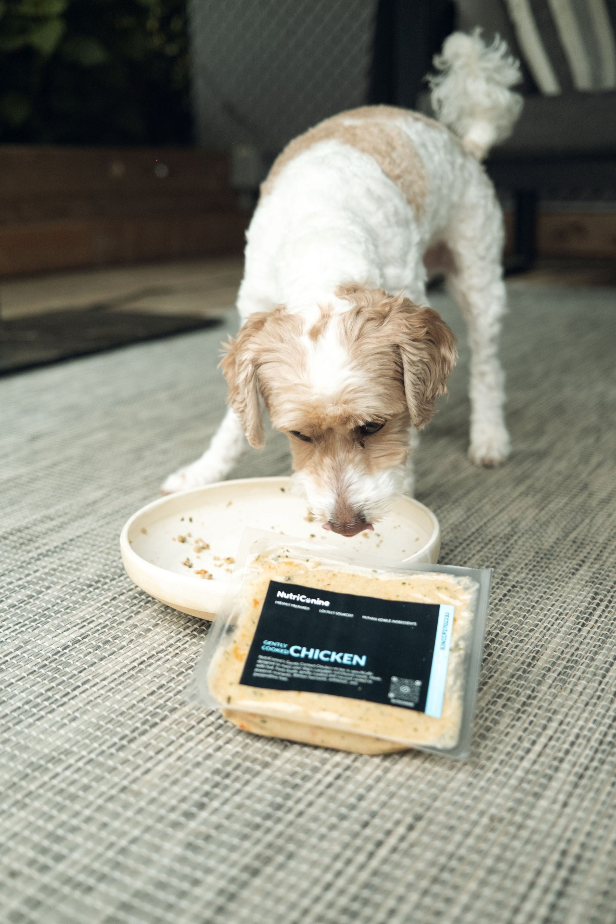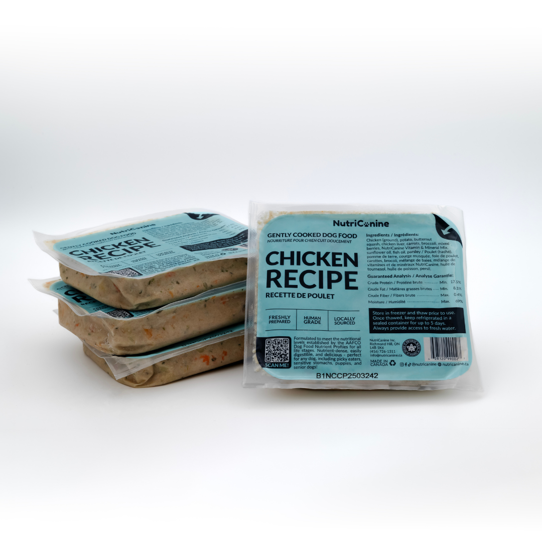 Treat your dog to our Gently Cooked Chicken Recipe, featuring premium, human-grade chicken, nutrient-dense broccoli, and carrots for a healthy coat. Transparently crafted for optimal nutrition, it's a bowl-lickin' good meal that celebrates your canine companion's well-being.