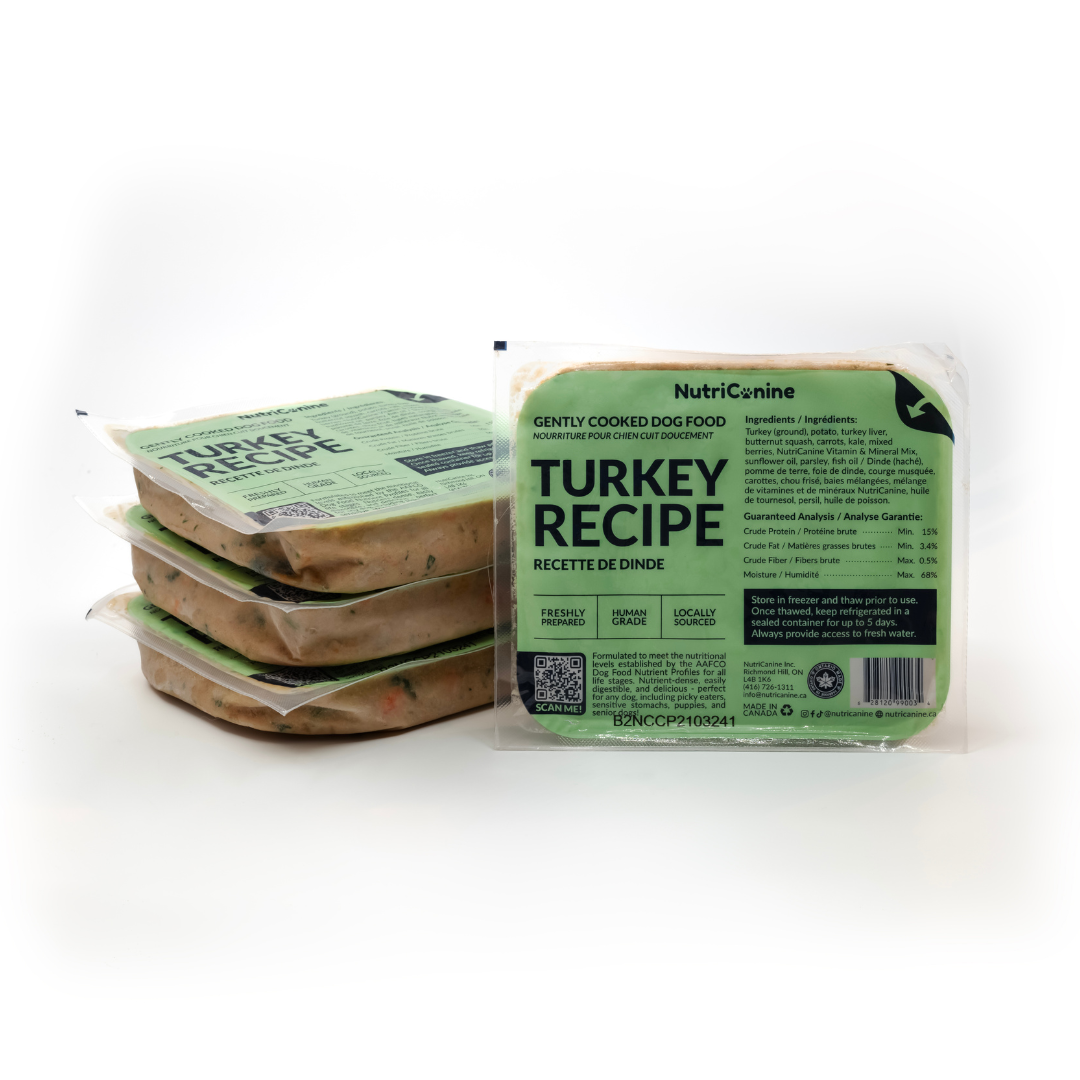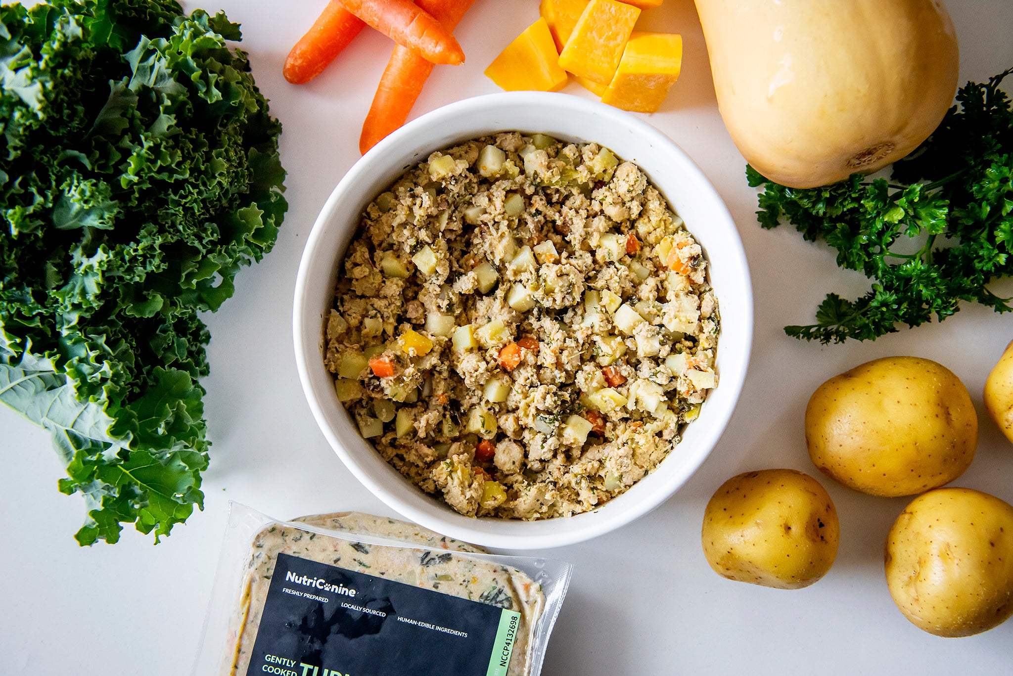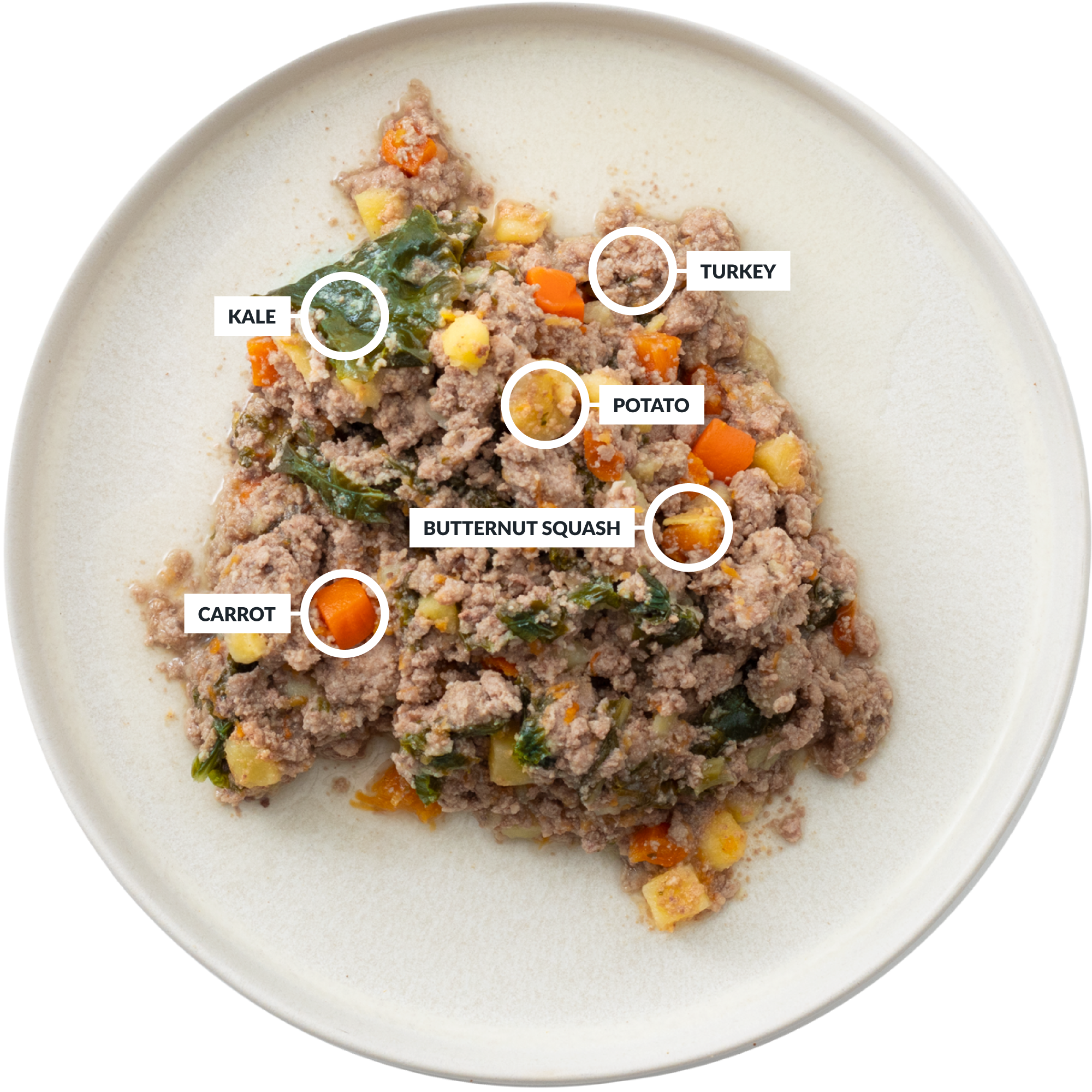 Turkey (ground), potato, turkey liver, butternut squash, carrots, kale, mixed berries, NutriCanine Vitamin & Mineral Mix, sunflower oil, parsley, fish oil.